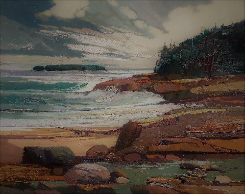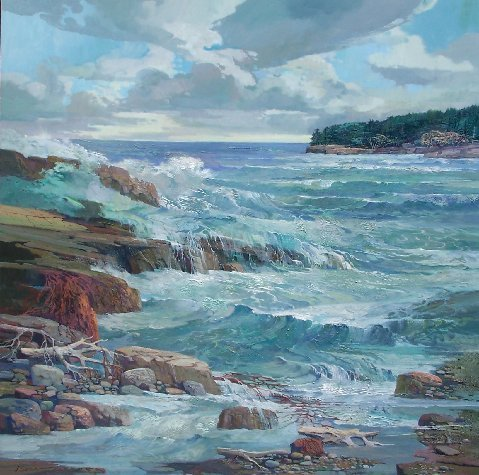 Maine's rocky and wild coast continues to be a favorite scenario for this prolific painter, who is a native New Englander. Sisson visits New England annually to soak in the moist salty air and play in the ever fascinating tide pools that hug the shoreline. He loves studying the unusual textures of coastal pebbles and likes to think people are beach-combing through his paintings and discovering the many shore inhabitants he has uncovered.